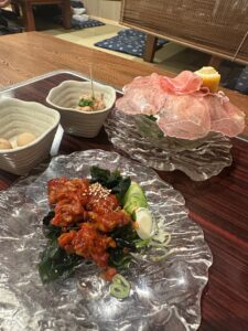 ピリ辛のユッケ風おつまみや、薄切り生ハムサラダ🥗も絶品!