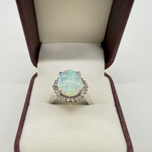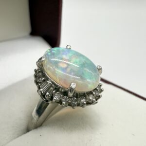 中央のオパールをぐるりと囲むようにセットされたダイヤモンドは、ラウンドカットとバゲットカットを組み合わせたクラシックな取り巻きデザイン💠